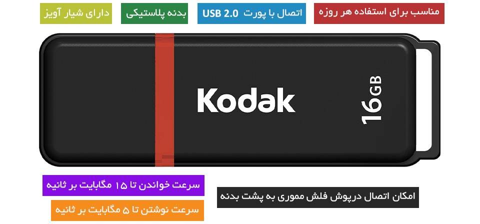 فلش مموری K102 از برند کداک (Kodak) بدنه پلاستیکی دارد و از آنجایی که با رابط USB 2.0 به کامپیوتر وصل میشود، بیشتر به درد جابجا کردن اسناد اداری و فایلهای کوچک میخورد. امکان وصل کردن درپوش فلش مموری به پشت بدنه و همچنین وجود شیاری برای اضافه کردن بند آویز از اصلیترین امکانات K102 هستند. این فلش مموری در چهار ظرفیت و از 8 گیگابایت تا 64 گیگابایت قابل تهیه است.