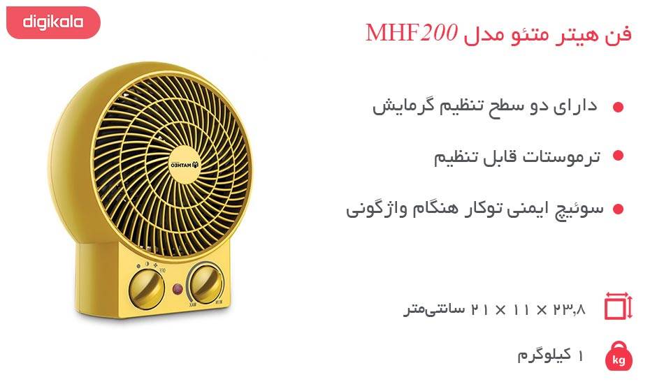 فن هیتر متئو مدل MHF200 یک بخاری برقی ایستاده بود که متناسب برای استفاده در اتاق خوابها، مغازهها یا سالنهای کوچک طراحی شده است. فن هیتر متئو دارای دو سطح تنظیم گرمایشی است که با چرخش هوای فن همراه میشود.ترموستات بهکار رفته در این دستگاه باعث ایمنی بیشتر میگردد. از ویژگیهای بارز متئو میتوان به سوییچ ایمنیاش اشاره کرد که در صورت برخورد اتفاقی یا واژگونی فن، به طور خودکار دستگاه را خاموش کرده و مانع از بروز اتفاق میشود.