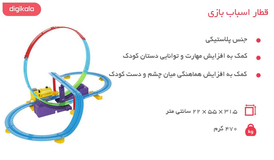 وقتی کودک در اتاقش قطاری دارد که قادر است بر روی ریل بزرگی به ابعاد 31 × 29 × 58 سانتی‌متر حرکت کند، با شور و شوق بیشتری به دنیای خیالی خود می‌پردازد.کودک دلبندتان را به دنیای خیالی ببرید و از او بپرسید که امروز با قطارش کجا سفر خواهد کرد؟ مسافرانش چه کسانی هستند؟