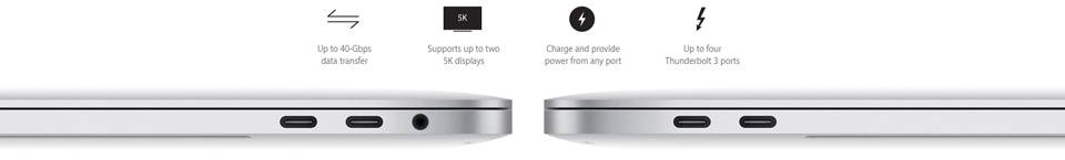 اپل در حرکتی انقلابی، تمام پورتهای قدیمی را از اطراف بدنه حذف و به جای آن از پورت Type-C «تاندربولت ۳» (Thunderbolt 3) استفاده کرده است. این پورتها از نظر جدید بودن که سرعت انتقال اطلاعات تا ۴۰ گیگابایت بر ثانیه را پشتیبانی میکنند، خوب هستند؛ اما در مقابل همهی دستگاهها از این پورت پشتیبانی نمیکنند حتما در استفاده از وسایل معمولی که هر روز با آنها سر و کار دارید مجبور خواهید بود از یک هاب استفاده کنید. این مورد در استفاده از پورتهای قدیمیتر مثل USB 2.0 یا USB 3.0 و HDMI وجود دارد.