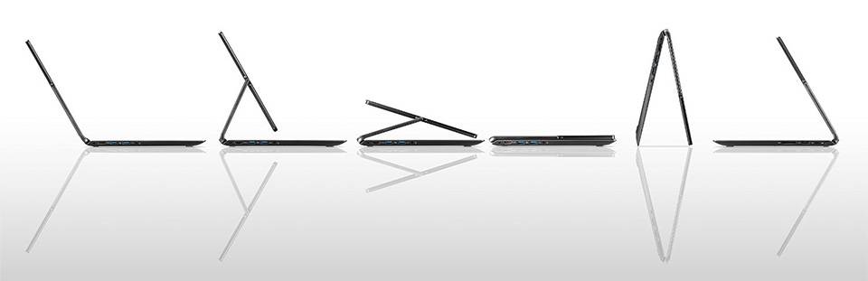 بدون شک در این محصول طراحی حرف اول را می‌زند و اولین فاکتوری است که نظرها را به خود جلب می‌کند. در بسیاری از لپ‌تاپ‌های هیبریدی، صفحه نمایش از قسمت لولای اتصال به بدنه چرخیده و در زاویه‌های مختلف تا 360 درجه چرخش کامل قرار می‌گیرد. اما برای این محصول چرخش صفحه نمایش به این شکل معمول نیست. صفحه نمایش این لپ‌تاپ در یک قاب نصفه قرار گرفته که به دو طرف لبه‌های صفحه نمایش متصل شده‌اند. به این ترتیب چرخش در این مدل از وسط صورت ‌می‌گیرد. جالب اینجاست که با این نوع طراحی دیگر نیازی نیست که لولای اتصال بدنه به صفحه نمایش 360 درجه کامل بچرخد. بلکه اگر بخواهید در حالت تبلت از این دستگاه استفاده کنید، باید در لپ‌تاپ را به حالت معمول (چیزی بین 90 تا 130 درجه) باز کنید و سپس صفحه نمایش را از وسط 180 درجه بچرخانید و دوباه در لپ‌تاپ را ببندید. در این حالت صفحه نمایش از پشت روی بدنه خوابیده و دستگاه به شکل یک تبلت درمی‌آید. اما این تمام کار نیست و به‌واسطه این نوع طراحی چرخشی، می‌توان لپ‌تاپ را در حداقل 6 حالت مختلف قرار داد. این حالت‌ها به‌خصوص در هنگام تماشای فیلم، وبگردی، ارائه فایل‌های پرزنتیشن در جلسات کاری، مطالعه فایل کتاب‌های الکترونیکی و مواردی از این قبیل بسیار پرکاربرد هستند.