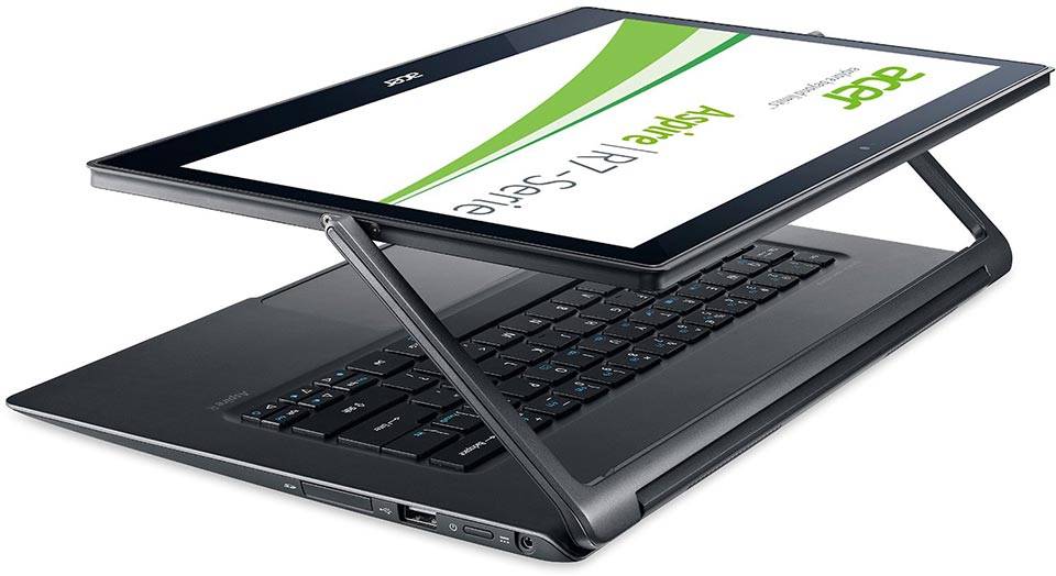 تاکنون شرکت‌های معتبر، مدل‌های متعددی از لپ‌تاپ‌های هیبریدی را تولید کرده‌اند که هر کدام طراحی و امکانات متفاوتی دارند و می‌توان از آن‌ها در حالت‌های مختلف استفاده کرد. یکی از این سری محصولات، لپ‌تاپ مدل «R7-371T»  برند «ایسر» است که طراحی متمایزی دارد و کمتر دستگاه هیبریدی را می‌توان شبیه به آن پیدا کرد. طراحی این لپ‌تاپ هیبردی 13.3 اینچی به این ترتیب است که صفحه‌نمایش مانند حالت معمول تمامی لپ‌تاپ‌ها، از قسمت پایین به بدنه متصل نیست؛ بلکه دو پایه از دو طرف بدنه‌ی لپ‌تاپ بالا آمده که صفحه‌نمایش را از وسط نگه‌می‌دارند. به این ترتیب صفحه‌نمایش به کمک این دو پایه، قابلیت چرخش 360 درجه پیدا می‌کند و می‌توان در حالت‌های مختلف از آن استفاده کرد؛ در نتیجه دست کاربر برای نحوه‌ی قرارگیری دستگاه و نوع استفاده از آن کاملا باز است. صفحه‌نمایش لمسی این محصول هم این انتخاب‌ها را گسترده‌تر کرده و حتی می‌توان از R7-371T مانند یک تبلت استفاده کرد. این محصول به‌واسطه‌ی این طراحی خاص، می‌تواند برای کاربری‌های مختلف در خانه، محیط کار و جلسات، سفرها و بسیاری از موارد دیگر مناسب باشد. همان‌طور که گفته شد، این لپ‌تاپ صفحه‌نمایش 13.3 اینچی لمسی دارد که قابلیت مالتی‌تاچ، پنل IPS، شفافیت و وضوح بالا و کیفیت Full HD از مزیت‌های آن هستند؛ البته به دلیل براق‌بودن روکش این صفحه، ممکن است در محیط‌های باز با تابش نور خورشید، زاویه‌ی دید کمی محدود شود. ایسر در ساخت این مدل از سخت‌افزارهای نسبتا خوبی استفاده کرده که برای کاربری‌های روزمره و نیمه‌حرفه‌ای مناسب به‌نظر می‌رسند؛ اما نباید انتظار بالایی از آن‌ها داشته باشید. پردازنده‌ی مرکزی Core i57 5500U اینتل، 8 گیگابایت رم و 256 گیگابایت حافظه‌ی داخلی از نوع SSD، سرعت و توان قابل‌قبولی برای اجرای نرم‌افزارهای محاسباتی ارائه می‌دهند؛ اما ازآنجایی‌که این مدل، پردازشگر گرافیکی مجزا ندارد و به چیپ آنبرد موجود در پردازنده‌ی مرکزی بسنده شده است، نباید برای اجرای برنامه‌های گرافیکی یا بازی‌های کامپیوتری روی آن حساب کنید.