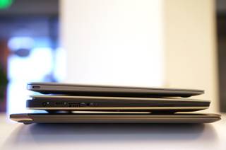 بعد از جذابیت ابعاد دستگاه به وزن آن می‌رسیم که باز هم حرف‌هایی برای گفتن دارد. با یک کیلو و ۲۹۰ گرم، این دستگاه از مک‌بوک یک کیلو و ۳۵۰ گرمی سبک‌تر ولی از HP Spectre یک کیلو و صد گرمی سنگین‌تر است. درباره‌ی ضخامت این دستگاه هم گفتیم که از نظر ابعاد کوچک‌ترین لپ‌تاپ ۱۳اینچی است ولی باریک‌ترین نیست و از هر دو دستگاه مک‌بوک و HP Spectre ضخیم‌تر است. این ضخامت برای این دستگاه حسن محسوب می‌شود چرا که تقریبا تمام پورت‌های لازم را در لبه‌ها جای داده است و این مسئله تقریبا در اکثر لپ‌تاپ‌های فوق‌باریک دیده نمی‌شود.