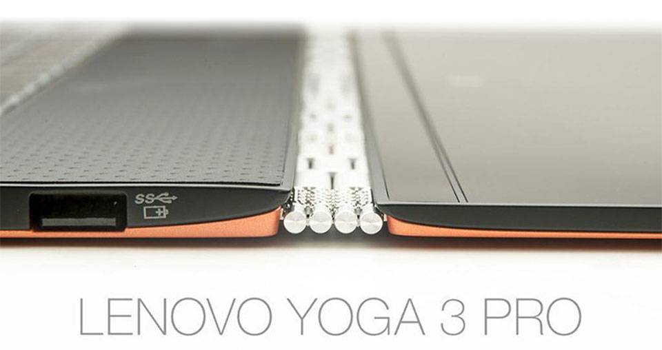 اگر لپ‌تاپ Yoga 3 Pro را در کنار Yoga 2 Pro قرار دهیم اولین و مهم‌ترین تفاوتی که در ظاهر آنها مشاهده می‌شود، تغییر شکل و ساختار لولای متصل کننده صفحه‌ی نمایش به بدنه است. در نسل‌های قبلی، دو لولای کوچک ساده در دو طرف این وظیفه را به عهده داشتند. اما در Yoga 3 Pro، لنوو لولای کاملا منحصر‌به‌فردی طراحی کرده است که نمونه شبیه به آن را در هیچ محصول دیگری پیدا نخواهید کرد. این لولای بزرگ سرتاسری از شش لولای کوچک و تکه‌هایی شبیه به بندهای فلزی ساعت در فضاهای بین آنها تشکیل شده است. طبق ادعای خود شرکت لنوو در ساخت این لولا از 813 قطعه آلومینیومی و فولادی استفاده شده است که نشان دهنده پیچیدگی طراحی و استحکام آن است. عامل چندتکه و بزرگ بودن، باعث پایداری بالای این لولا شده است. به ترتیبی که به راحتی می‌توان صفحه‌ی نمایش را در زوایای مختلف نسبت به بدنه قرار داد و با کمترین لرزش و تکان ممکن صفحه آن را لمس کرد. این ویژگی به‌خصوص در حالت‌های لپ‌تاپ و ایستاده به خوبی خودنمایی می‌کند.