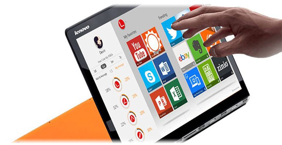 صفحه‌نمایش 13.3اینچی لمسی هم از دیگر نقاط قوت این مدل محسوب می‌شود. کیفیت QHD با دقت تصویر 2560×1440 پیکسل با پنل IPS و قابلیت تشخیص حرکت Leap Motion، این صفحه‌نمایش را به یکی از بهترین نمونه‌ها در بین دیگر محصولات هم‌رده تبدیل کرده است. همان اندازه که کار با این صفحه‌نمایش لمسی در حالت تبلت دلچسب است، کار با کیبورد و تاچ‌پد یک‌تکه دستگاه در حالت لپ‌تاپ هم حس خوبی دارد. با اینکه به دلیل کوچک‌بودن اندازه‌ی این محصول فضای کمی برای تعبیه کیبورد وجود داشته، اما باز هم لنوو از یک کیبورد جزیره‌ای با کلیدهای بزرگ استفاده کرده که برای تایپ‌کردن‌های طولانی‌مدت مناسب است؛ همچنین فضای اطراف کیبورد و تاچ‌پد با روکش محکمی پوشانده شده که سطح آن کمی از کلیدهای کیبورد بالاتر است. به این ترتیب در شرایط استفاده در حالت تبلت یا ایستاده و قرارگرفتن کیبورد روی میز، فشاری به کلیدها وارد نشده و از خش‌افتادگی یا آسیب‌دیدن آن‌ها جلوگیری می‌شود. لنوو این محصول را در سه رنگ نقره‌ای، بژطلایی و نارنجی ارائه کرده است تا با انواع سلیقه‌ها هم‌خوانی داشته باشد.