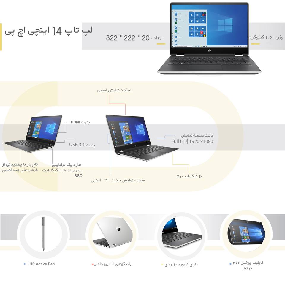 لپ تاپ ۱۴ اینچی مدل Pavilion X360 شرکت اچ پی یک محصول قوی با کارایی‌های بسیار زیاد با امکانات عالی به حساب می‌‌آید. لپ‌‌تاپی که برای مصارف مهندسی، طراحی‌های آماتور و نیمه حرفه‌ای، بازی‌های آماتور و متوسط از نظر گرافیکی، خانگی، اداری، تحقیقاتی و دانشجویی به همراه تماشای فیلم، گوش دادن به موسیقی، گشت و گذار در اینترنت، و از همه مهم‌تر برای محاسبات سنگین حسابداری و منطقی و مهندسی مناسب است. صفحه نمایش بسیار خوبی دارد و بلندگوهای با کیفیت آن نظر شما را به خود جلب می‌‌کند. لپ‌تاپ ۱۴ اینچی اچ پی مدل Pavilion X360 برای انجام کارهای روزانه، سنگین تا فوق سنگین (بسته به نوع پردازش ها) گزینه بسیار خوبی خواهد بود.