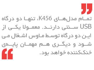 تاچپد سری K456 سطحی بزرگ و صیقلی دارد تا انگشت دست بهراحتی روی آن سر بخورد. فرمانهای چندلمسی هم بهراحتی شناسایی میشوند. کلیدهای چپ و راست هم با اینکه در سطح تاچپد مستتر شدهاند؛ با توجه به عمق و نقطهی فشار مناسبشان، بهراحتی حس میشوند. به طور کلی، اگر نیاز خاصی به استفاده از ماوس نداشته باشید، تاچپد K456 نیازتان را برطرف میکند. بهخصوص اینکه با توجه به تعداد محدود پورتهای USB دستگاه، بد نیست قید استفاده از ماوس را بزنید.