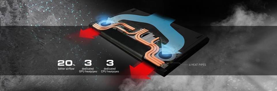 یکی از مهمترین و جذابترین این فناوریها، سیستم خنککنندهی Cooler Boost است. سیستمی که MSI آن را برای اولین بار ابداع و به نام خود ثبت کرده است. تفاوت اصلی این سیستم خنککننده با سایر طراحیها در این است که یک ماژول متشکل از دو فن حرارتی گرما را از CPU و GPU دور میکند. کولر بوست نسخههای مختلفی دارد اما مدلی که در GP62 7RD مورد استفاده قرار گرفته و نسبت به سری پیشین خود پیشرفتهای زیادی داشته، Cooler Boost 4 است که با دو فن و شش لوله که به نسبت مساوی بین GPU و CPU تقسیم شده است، هوای گرم را از پردازندهها دور میکند. در طراحی جدید میزان جریان هوا حدودا ۲۰درصد افزایش داشته و جالب است بدانید این سیستم خنککننده برای کنسولهای بازی رومیزی مورد استفاده قرار میگیرد و قدرت بسیار خوبی دارد. این طراحی وظیفهی خود را برای خنککردن قطعات داخلی به خوبی انجام میدهد اما صدای فن گاهی بلند است و اگر با هدفون بازی نکنید ممکن است کمی آزاردهنده باشد.