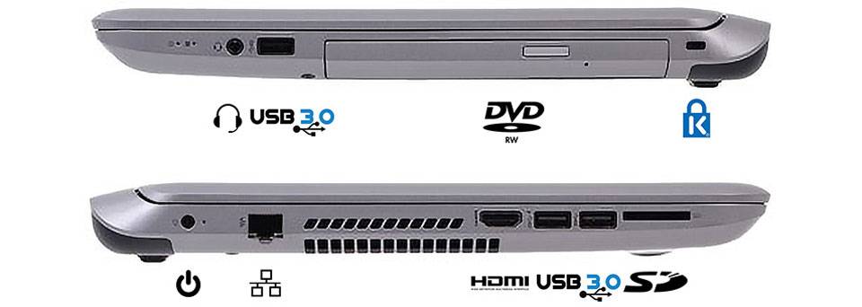 جالب است که با وجود بالا رده بودن دستگاه، این لپتاپ از داشتن پورتهایی نظیر eSATA، Display Port، Thunderbolt و حتی VGA محروم است. شاید یکی از سیاستهای HP این بوده تا برای خروجیهای تصویر، کاربران بیشتر از پورتهای HDMI و تکنولوژیهای بیسیم مانند Intel’s Wireless Display استفاده کنند. بر لبه سمت چپ، سوکت ورودی برق دستگاه در کنار پورت شبکه گیگابیتی Ethernet که ماهرانه طراحی شده است، قرار دارد. خروجی هوای گرم سیستم خنک کننده دستگاه نیز در کنار پورت HDMI روی همین لبه تعبیه شده است. دو پورت USB 3.0 در کنار کارتخوان دستگاه نیز در این قسمت دستگاه قرار گرفته اند. لبه سمت راست میزبان قفل ضد سرقت Kensington، درایو نوری، یک پورت USB 3.0 دیگر و جک 3.5 میلی متری صدا است. در لبه عقبی و جلویی دستگاه هیچ گونه پورت یا اتصالی وجود ندارد. برای ارتباط بیسیم HP به درستی از چیپ شبکه بیسیم Intel Dual Band Wireless-AC 3160 استفاده کرده است که این چیپ از فرکانسهای پایین تا Wi-Fi گیگابیتی با استاندارد 802.11 ac را پشتیبانی میکند. همچنین این چیپ دارای نسل چهارم بلوتوث نیز هست.