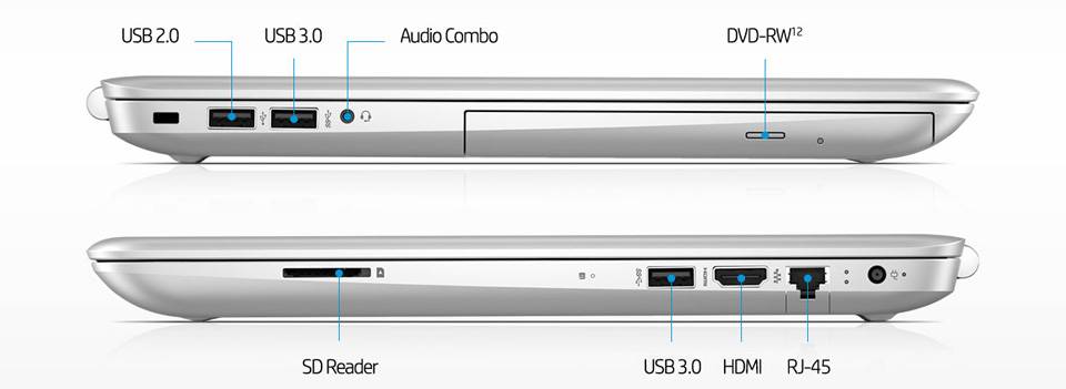 لبه چپ میزبان درایو نوری، دو عدد پورت USB 3.0 و جک 3.5 میلیمتری صدای دستگاه از نوع کمبو است. شیار قفل کنسینگتون هم روی همین لبه قرار داده شده. سمت چپ دستگاه میتوان ورودی شارژر، پورت شبکه LAN که متاسفانه سرعتش 10/100 مگابیت بر ثانیه است، تک پورت USB 2.0، پورت دوم USB 3.0، پورت HDMI و کارتخوان دستگاه را مشاهده کرد.