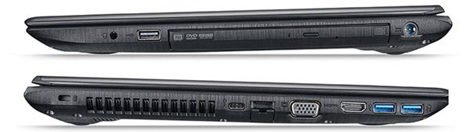 این لپ‌تاپ از لحاظ پورت‌های ورودی و خروجی هیچ کم و کاستی نسبت به دیگر محصولات هم‌رده‌ی خود ندارد و برای اتصال انواع ابزارهای جانبی آماده است. لبه‌ی سمت راست میزبان جک ۳.۵ میلی‌متری ترکیبی هدفون و میکروفون، یک پورت USB 2.0 و درایو نوری است. روی لبه‌ی چپ هم دو پورت USB 3.0، پورت HDMI، خروجی تصویر VGA، پورت شبکه‌ی Ethernet، پورت USB Type-C، دریچه‌ی تهویه‌ی هوای گرم داخلی و قفل کنسینگتون است. روی لبه‌ی جلویی دستگاه اسلات کارت خوان SD و LEDهای نشانگر وضعیت سیستم قرار دارد و روی لبه پشتی هم هیچ پورتی نیست. اتصالات بی‌سیم لپ‌تاپ از طریق بلوتوث داخلی نسخه ۴.۱ و WiFi استاندارد 802.11 a/b/g/n تامین می‌شود.