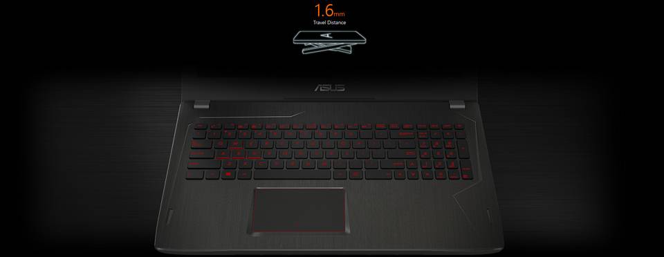 این لپتاپ به یک کیبورد یکپارچهی کامل و بزرگ مجهز است که بازهی کامل حروف همراه کلیدهای نامپد در آن وجود دارند. شکل جزیرهای و اندازهی بزرگ کلیدها به شما اجازه میدهد با دقت و سرعت بالا تایپ کنید. کلیدها بسیار نرموبیصدا کار میکنند و با فشار کمی عمل خواهند کرد. صدای این کیبورد به حدی کم است که حتی در محیطهای کاملا ساکت مانند کتابخانه هم میتوانید از این لپتاپ استفاده کنید. تمامی کلیدها مشکی رنگ هستند و حروف روی آنها به رنگ قرمز است که ظاهر شیک و جذابی به این لپتاپ دادهاند. همچنین کلیدهای WASD با پایههای قرمز حس اینکه این لپتاپ مخصوص بازی هم هست را بیشتر تداعی میکند. از دیگر خصوصیات کیبورد این محصول وجود نور پسزمینه است که میتوانید آن را در سه سطح روشنایی تنظیم یا آن را به طور کامل خاموش کنید. تابش این نور قرمزرنگ از پشت حروف قرمز رنگ جلوهی زیبایی در شب به لپتاپ میدهد و تداعیکنندهی لپتاپهای مخصوص بازی است.