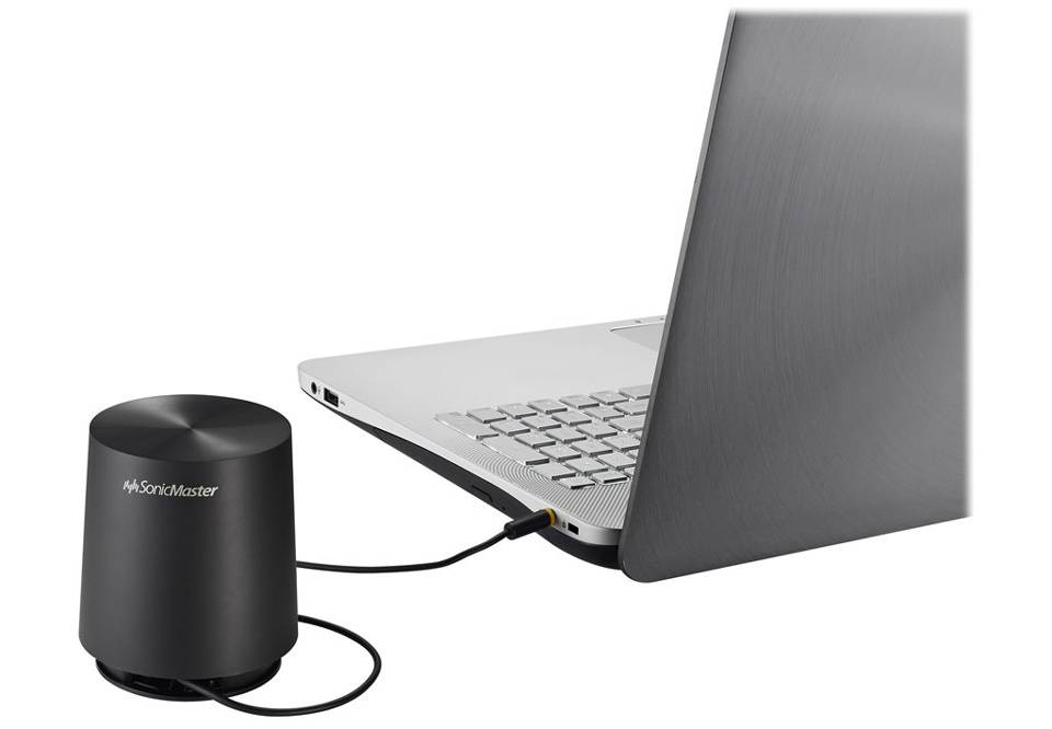 اما ایسوس به این قناعت نکرده و یک ساب ووفر SonicMaster مجزا هم به همراه این محصول ارایه کرده که به پورت مخصوص و زردرنگی که بر روی لبه‌ی سمت چپ دستگاه قرار دارد، متصل می‌شود. این ساب ووفر صدای بیس قدرتمندی تولید می‌کند و در کنار چهار بلندگوی اصلی دستگاه، تجربه بسیار لذت‌بخش و متفاوتی در گوش دادن به موسیقی دارد. طبق ادعای ایسوس این ساب‌ووفر صدایی با فرکانس پایین‌ و قدرت بیس بالاتر در مقایسه با بسیاری از لپ‌تاپ‌های بازار تولید می‌کند.