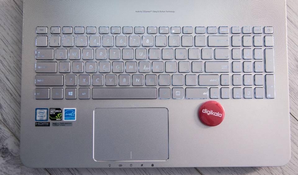 این لپتاپ مجهز به یک کیبورد یکپارچه کامل و بزرگ است که بازه کامل حروف به همراه کلیدهای عددی ماشین حساب (کلیدهای Num-Pad) در آن وجود دارند. شکل جزیرهای و اندازه بزرگ کلیدها به شما اجازه میدهد با دقت و سرعت بالا تایپ کنید. کلیدها بسیار نرم و بیصدا کار می کنند و با فشار کمی عمل خواهند کرد. صدای تایپ کردن با این کیبورد به حدی کم است که حتی در محیطهای کاملا ساکت مانند کتابخانه هم میتوانید از این لپتاپ استفاده کنید. تمامی کلیدها نقره ای رنگ هستند و حروف روی آنها به رنگ خاکستری است که ظاهر شیک و جذابی به این لپتاپ دادهاند. البته شاید برخی از کاربران ترجیح میدادند که کلیدهای این لپتاپ هم مانند لپتاپهای شرکت اپل به رنگ مشکی باشد، اما ایسوس به منظور یکدست شدن شکل ظاهری این مدل از رنگ روشن استفاده کرده است. از دیگر خصوصیات کیبورد این محصول وجود نور پسزمینه است که میتوانید آن را در سه سطح روشنایی تنظیم کنید. تابش این نور سفید رنگ از پشت حروف خاکستری رنگ، جلوه زیبایی در فضاهای تاریک به لپتاپ میدهد.