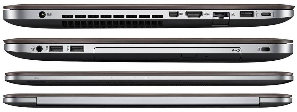 لپ‌تاپ N552 یک دستگاه مالتی‌مدیاست و کامل‌بودن پورت‌ها و اتصالات، یک ضرورت برای آن محسوب می‌شود. ایسوس هم کاملا به این امر واقف بوده و گستره‌ی کاملی از پورت‌های کاربردی را در این لپ‌تاپ تعبیه کرده است: هم پورت‌های نسل‌های قبلی و هم پورت‌های نسل جدید مانند USB Type-C. روی لبه‌ی کناری سمت راست جک ورودی و خروجی صدا، دو پورت USB 3.0، درایو نوری و قفل Kensington قرار گرفته است. در لبه‌ی سمت چپ هم محل اتصال کابل برق شارژر، دریچه‌ی خروجی هوای گرم، یک پورت mini-Display، یک پورت HDMI، یک پورت شبکه اترنت LAN، یک پورت USB 3.0 و یک پورت USB Type-C قرار گرفته است. به این ترتیب شما هیچ محدودیتی در اتصال ابزارهای جانبی با انواع اتصالات نخواهید داشت و این پورت‌های متعدد و کامل در هر دو طرف لپ‌تاپ در دسترس هستند. روی لبه‌ی جلویی در سمت چپ، اسلات کارت حافظه قرار گرفته است که علاوه‌بر پشتیبانی از SD Card توانایی خواندن کارت‌های حافظه (CompactFlash (CF را هم دارد که معمولا در دوربین‌های عکاسی دیجیتال کاربرد زیادی دارند. روی لبه‌ی جلویی دقیقا زیر تاچ‌پد چند چراغ LED کوچک هم وجود دارد که نشانگر وضعیت سیستم هستند. این لپ‌تاپ به منظور اتصال بی‌سیم به شبکه‌ی داخلی یا اینترنت مجهز به WiFi با استاندارد 802.11 b/g/n و برای اتصال به دیگر سیستم‌ها و ابزارها دارای اتصل بلوتوث است.