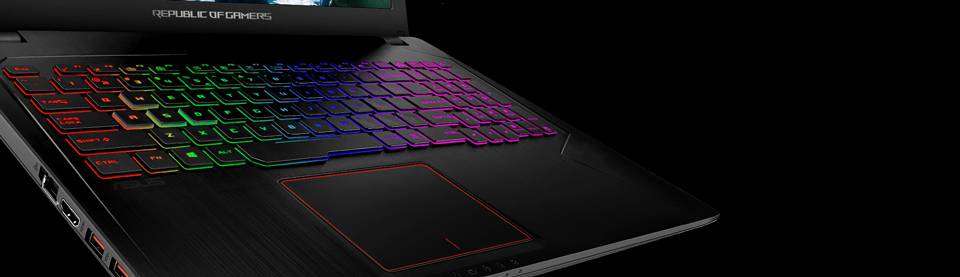 مسلما کیبورد این دستگاه باید با دیگر لپتاپها متفاوت باشد تا بتوان بهراحتی آن را از یک لپتاپ مالتیمدیا تشخیص داد. ولی با کمال تعجب ایسوس حروف روی کلیدهای کیبورد را قرمزرنگ طراحی نکرده است و تمام کلیدها مشکی با حروف سفید (بی رنگ) هستند و فقط زمانی که دستگاه روشن کنید یا تنظیمات آن را تغییر دهید نور پسزمینهی رنگینکمانی این دستگاه را به یک محصول مخصوص بازی تبدیل میکند. حتی پایهی کلیدهای WASD هم به رنگ قرمز نیستد تا حس بهتری به بازیکنان بدهند. نور پسزمینهی این کیبورد قابلتنظیم با کلیدهای fn به همراه F3 و F4 است. اندازهی کلیدها بزرگ و مناسب است. فاصلهی بین کلیدهای این کیبورد جزیرهای هم کاملا استاندارد است و درصد خطا هنگام بازی یا تایپ به حداقل میرسد. همانطور که گفته شد، با اینکه جنس روکش میان کلیدها، آلومینیوم یکپارچهی برسخورده است، این قسمت مقاومت کمی در مقابل فشار دارد و کمی خم میشود.