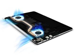 برای خنکسازی واحد پردازندهی مرکزی (CPU) و پردازندهی گرافیکی (GPU) از سیستم ترکیبی فن و لولهی مسی استفاده شده است. دو عدد فن در این سیستم به کار رفته که هر کدام روی یکی از واحدهای پردازشی نصب شدهاند و میتوانند با راندمان بالایی این واحدها را خنک کنند. نتیجه اینکه از گرمشدن بیش از حد سختافزار جلوگیری میشود و سیستمی پایدار برای بازیکردن یا کار سنگین کشیدن از لپتاپ فراهم میآید. در بحث خنکسازی، جا دارد که از فناوری دیگری با نام IceCool هم نام برد. در این فناوری با تغییراتی در مدارات و قطعات قرار گرفته در پایین استراحتگاه دست، دمای این بخش همواره بین 28 تا 35 درجهی سانتیگراد نگه داشته میشود. این بازهی دمایی به مراتب کمتر از دمای طبیعی بدن است و هنگامی که کف دست این خنکای عجیب را زیر خود داشته باشد، صاحباش را تشویق میکند تا ساعتها پشت لپتاپ بنشیند و بازی کند.
