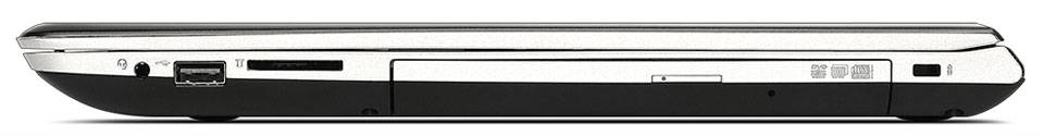 روی لبه‌ی سمت راست هم جک 3.5 میلی‌متری صدا، تک پورت USB 2.0 و کارت‌خوان SD قرار دارد؛ البته وقتی کارت حافظه‌ی SD را درون آن قرار می‌دهید، تقریبا نیمی از آن بیرون می‌ماند. درایو نوری دستگاه و شیار قفل کنسینگتون (Kensington) هم ‌روی این لبه قرار دارد.