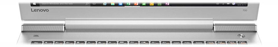 بالای قاب صفحه‌نمایش، یک وب کم تعبیه‌شده که می‌توانید با کیفیت HD 720p به ضبط تصاویر یا ارتباط ویدیویی بپردازید. در قسمت بالایی کیبورد، در گوشه‌ها دو بلندگو قرار دارد که به‌اصطلاح به آن Face Front می‌گویند. معمولا بلندگوهای لپ‌تاپ‌ها زیر دستگاه تعبیه می‌شوند که همین موضوع باعث می‌شود درصدی از صدای تولیدی به علت بسته‌بودن فضای اطراف بلندگو خفه شود. لنوو مانند سری Y700، در طراحی Ideapad 700، محل قرارگیری بلندگوها را تغییر داده تا صدایی بلند‌تر و واضح‌تر به گوش برسد. شرکت معروف JBL هم مسئولیت ساخت بلندگوهای این دستگاه را به عهده گرفته است. در کل باید گفت صدای تولیدی آن‌قدر باکیفیت و بلند است که به استفاده از هدفون یا بلندگوهای خارجی نیازی نباشد.
