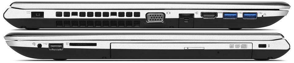 لپتاپهای سری Z51 از لحاظ پورتهای ورودی و خروجی و اتصالات شرایط مساعدی دارند و میتوان انواع ابزارهای جانبی را به آنها متصل کرد. روی لبه سمت چپ دستگاه محل اتصال شارژر مخصوص لنوو، دریچههای تهویه هوا، خروجی تصویر VGA، پورت شبکه داخلی LAN، خروجی تصویر و صدای HDMI و دو پورت USB 3.0 تعبیه شده است. لبه سمت راست کمی خلوتتر است و قفل کنسینگتون، درایو نوری، کارتخوان، یک پورت USB 2.0 و جک 3.5 میلیمتری ترکیبی ورودی و خروجی صدا روی آن مشاهده میشود. روی لبه جلویی چراغهای LED نشانگر وضعیت دستگاه وجود دارند و هیچ پورتی هم روی لبه پشتی نیست. تغییر مثبت Z51 نسبت به Z50 تبدیل شدن یکی از پورتهای USB 2.0 به USB 3.0 است که با ابزارهای جانبی نسل جدید سازگاری بیشتری دارد. اتصالات بیسیم این لپتاپ از طریق بلوتوث داخلی نسخه 4.0 و WiFi با استاندارد 802.11a/c صورت میگیرد که برای اتصال به دیگر ابزارهای بلوتوث و شبکه اینترنت کاملا ایدهآل هستند.