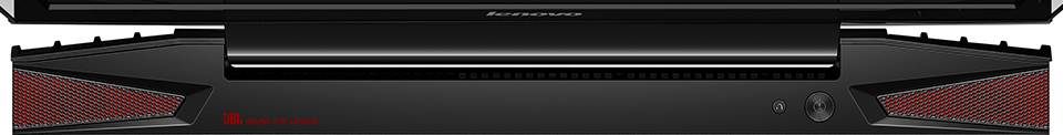 بلندگوهای Y5070 ساخت کمپانی معروف JBL هستند و کیفیت صدای بسیار خوبی دارند. دو بلندگو در طرفین بالای کیبورد قرار دارند که با یک محافظ قرمزرنگ مشبک پوشیده شدهاند. این بلندگوها به علت روبهبیرونبودن و بازبودن سطح خروجی، از صدای بلند و شفافی برخوردار هستند که با یک ساب ووفر که زیر دستگاه قرار دارد، پشتیبانی میشوند. عمق صدا و بیس بسیار رضایتبخش توصیف میشود و برای تماشای فیلم یا گوشدادن به موسیقی در یک اتاق کوچک کاملا مناسب است و به بلندگوهای خارجی نیازی نیست. زیر دستگاه، دو تکهی پلاستیکی قرار گرفتهاند که دو وظیفه برعهده دارند: اول اینکه از سرخوردن و تکانخوردن دستگاه جلوگیری میکنند و وظیفهی دیگرشان ایجاد فضایی خالی بین سطح زیرین دستگاه و سطحی است که لپتاپ روی آن قرار میگیرد. علت این موضوع آن است که صدای بیس که زیر دستگاه قرار دارد، بهتر و بلندتر به گوش برسد. درمجموع ما به کیفیت و بلندی صدای Y5070 نمرهی قبولی را اختصاص میدهیم.