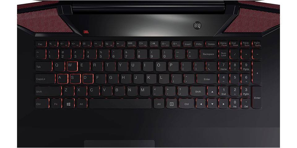 اگر به تماشای فیلم با لپتاپتان علاقهی زیادی دارید، از ترکیب نمایشگر با بلندگوهای JBL سری Y700، رضایت کامل خواهید داشت. در بالا و دو طرف کیبورد، دو شبکهی قرمز بزرگ قرار دارند که در کنار سابووفری که زیر کیبورد تعبیه شده، صدای ۲٫۱ کانالهی رسا، شفاف و بلندی را تولید میکنند. صدای این بلندگوها بهقدری خوب است که واقعا به تهیهی هدفون برای بازی یا تماشای فیلم نیازی ندارید.