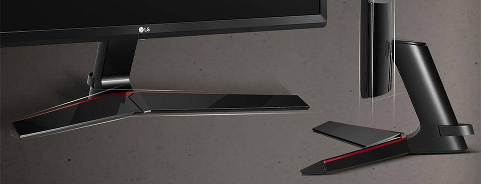 الجی در سری جدید مانیتورهایش از پایهی خاصی استفاده میکند که عنوان V-Line را برای آن در نظر گرفتهاست. از عنوان در نظر گرفته شده میتوان خیلی راحت به V شکل و خطی بودن پایه پی برد. اینکه در پایه از هیچ خم و انحنایی استفاده نشده، بر جذابیت آن افزوده است و وجود یک نوار قرمز باریک در پایینترین قسمت پایه، کمی ظرافت و زیبایی را هم چاشنی کار مانیتور 27MP59G کردهاست. این ترکیب مشکی و قرمز در پایه با میز کامپیوتر هر بازیکنندهای جور درمیآید و برای کسی که بازی نمیکند هم جذابیت و زیبایی خاص خود را به همراه دارد. مانیتور روی این پایه قابلیت تنظیم زاویه دارد و میتواند زاویهی دید عمودی را به نحوی تنظیم کنید که برای داشتن بهترین تصویر نیاز نباشد خودتان جابجا شوید.