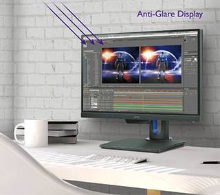 پنل از نوع IPS با نور پسزمینه LED با میزان روشنایی 350 کاندلا بر متر مربع است که نور کافی برای کار در محیطهای سرپوشیده اداری روشن را هم دارد. بنکیو از یک روکش مات برای صفحهنمایش استفاده کرده که میتواند دو جنبه مختلف داشته باشد. از طرفی میتواند مانع بسیار خوبی برای بازتاب نور محیط در مانیتور باشد که معمولا عامل آزاردهندهای در محیطهای اداری با تعداد زیادی چراغ روشن در اتاقهای کار است. اما از طرفی هم دستهای از طراحان گرافیک دوست دارند از مانیتورهای با صفحه نمایش براق استفاده کنند که تصاویر را بسیار شفاف و درخشان نمایش میدهند.