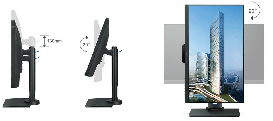 بدنه این مانیتور طراحی عجیب و چندان متفاوتی ندارد و در نگاه اول شما را خیره نمیکند. یک بدنه کاملا مشکی و یکدست بدون هیچ خمیدگی و زوایای خاص. هیچ قسمتی از بدنه آلومینیومی نیست و حتی پایهها هم از پلاستیک ساخته شدهاند، البته از یک پلاستیک بسیار باکیفیت. گویا بنکیو در ساخت این مانیتور بیشتر به کیفیت کارایی توجه و تاکید داشته تا طراحی زیبا. صفحه 25 اینچی این مانیتور به اندازه کافی میز کار شما را اشغال میکند، به همین دلیل لبههای مانیتور بسیار باریک و با حاشیه کمتر از 1 سانتیمتر طراحی شده است. به این ترتیب حتی قرار دادن دو مانیتور در کنار یکدیگر هم فاصله چندانی بین دو صفحه ایجاد نمیکند. مانیتور PD2500Q دو اسپیکر داخلی 2 وات برای پخش صدا و جک 3.5 میلیمتری اتصال هدفون هم دارد. از پورتهای ارتباطی آن هم میتوان به HDMI، DisplayPort، mini DisplayPort و USB 3.1 اشاره کرد که اتصالات کاملی برای این محصول هستند و طبیعتا روی چنین کالایی نباید انتظار مواجه با پورتهای نسل قبل مانند DVI و D-Sub را داشته باشیم. پایه با قابلیت تغییر ارتفاع تا 13 سانتیمتر و زاویه تا 20 درجه و چرخش 90 درجهای و استفاده به حالت عمودی هم از دیگر ویژگیهای این مانیتور است.