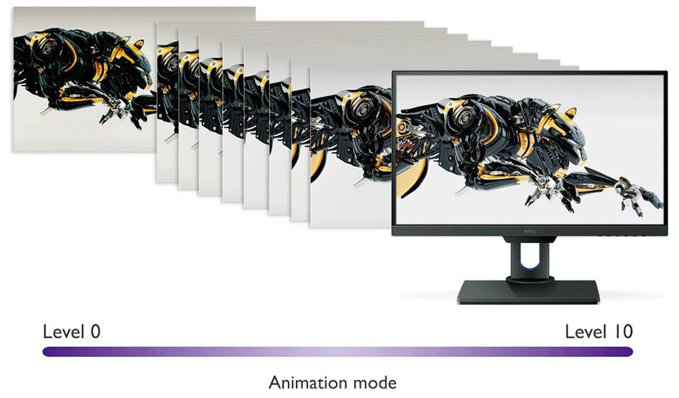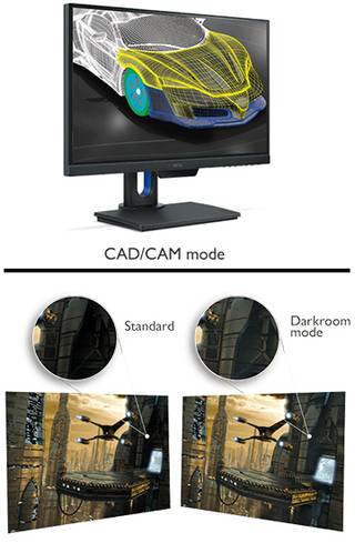 جدای از کیفیت بالای خروجی، این مانیتور امکانات ویژهای را هم برای گرافیستها و طراحان گرافیکی و صنعتی دارد که از جمله مهمترین آنها میتوان به سه مود کاری CAD/CAM، Darkroom و Animation اشاره کرد. کاربر میتواند بسته به نیاز خود و به سادگی از طریق تنظیمات مانیتور یکی از این مودها را انتخاب کند. مود CAD/CAM برای نقشهکشها و طراحان صنعتی ساخته شده است. در هنگام کار با نرمافزارهایی مانند Pro/ENGINEER، SOLIDWORKS، AutoCAD و CATIA شما بیشتر با خطوط سر و کار دارید. پس چه بهتر که این خطوط به شکل واضحتری روی مانیتور نمایش داده شوند تا به راحتی قابل تشخیص و تمیز دادن از یکدیگر باشند. مود CAD/CAM این کار را برای کاربر انجام میدهد و به نوعی با ایجاد کنتراست بالا، خطوط را نمایانتر از حالت معمول میکند. مود Darkroom برای ادیتورها و گرافیستها مناسب است و با تنظیم خودکار روشنایی و کنتراست تصویر، نقاط تاریک را روشنتر نمایش میدهد تا جزئیات پنهان شده در این نقاط بهتر نمایش داده شوند و راحتتر برای کاربر قابل رویت باشند. مود Animation هم تقریبا همین کار را برای سازندگان انیمیشن و تصاویر سهبعدی انجام میدهد. به ترتیبی که کاربر میتواند نقاط تاریک را تا 10 مرحله روشنتر کند بدون اینکه روی نقاط روشن تصویر تاثیر منفی بگذارد و آنها را بیش از حد روشن کرده یا در اصطلاح بسوزاند.