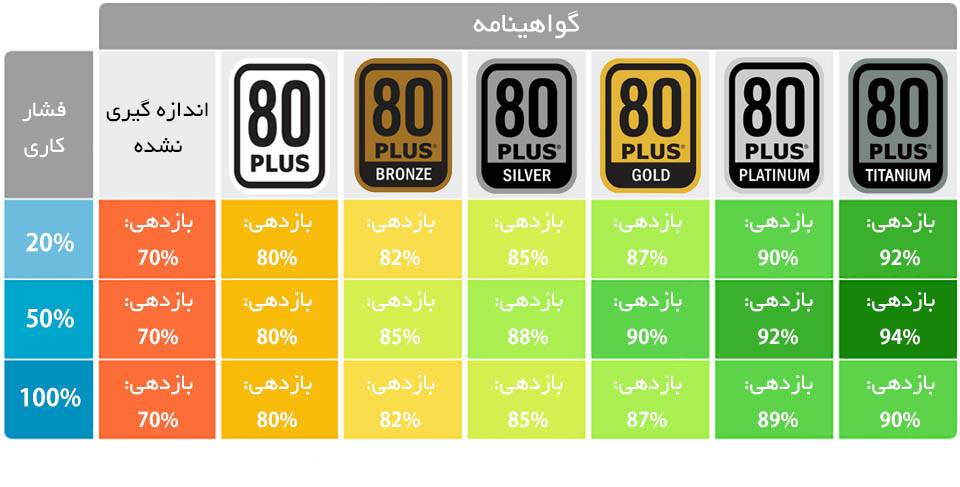 با کمی دقت روی جعبهی پاورها معمولا عبارتی مانند 80 Plus قابل مشاهده است. 80 Plus استانداردی برای اعلام میزان هدررفت انرژی در پاور است. عدد ۸۰ ارائهشده در نام این محصول نشان از بازدهی ۸۰ درصدی آن دارد. این استاندارد را معمولا با رنگهای برنزی (BRONZE)، نقرهای (SILVER)، پلاتینیومی (PLATINUM)، طلایی (GOLD) و تیتانیومی (TITANUM) نشانمیدهند. علاوهبر این رنگها در استاندارد 80 Plus موردی بدون رنگ در پاورهای پایینرده قابل مشاهده است که هیچ رنگی ندارد این مدل از استاندارد 80 Plus که گاها با نام Basic هم از آن نامبرده میشود، شامل کم بازدهترین پاورهاست. در جدول زیر اطلاعاتی از میزان بازدهی هرکدام از این استانداردها به تفکیک بیان شده است. با توجه به این اطلاعات یک پاور ۷۵۰ وات از نوع 80 Plus GOLD میتواند در فشار کاری (PSU Load) ۵۰ درصدی، بازدهی ۹۰ درصد داشته باشد که برای این پاور میزان توان خروجی که میتوان روی آن حساب باز کرد، ۶۷۵ وات است.
