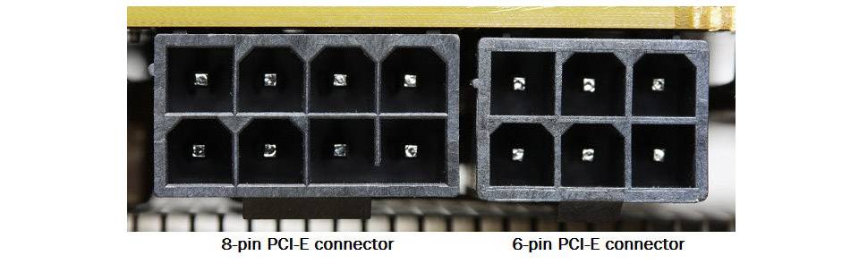 کانکتور ۸پین PCI-E و ۶پین PCI-E: کارتهای گرافیک حرفهای برای انجام پردازشهای گرافیکی سنگین به انرژی بیشتری نسبت به میزان انرژیای که از درگاه PCI-E دریافت میکنند، نیاز دارند. برای تامین این انرژی روی کارتهای گرافیک حرفهای رابط ۶پین و ۸پین در نظر گرفته میشود.