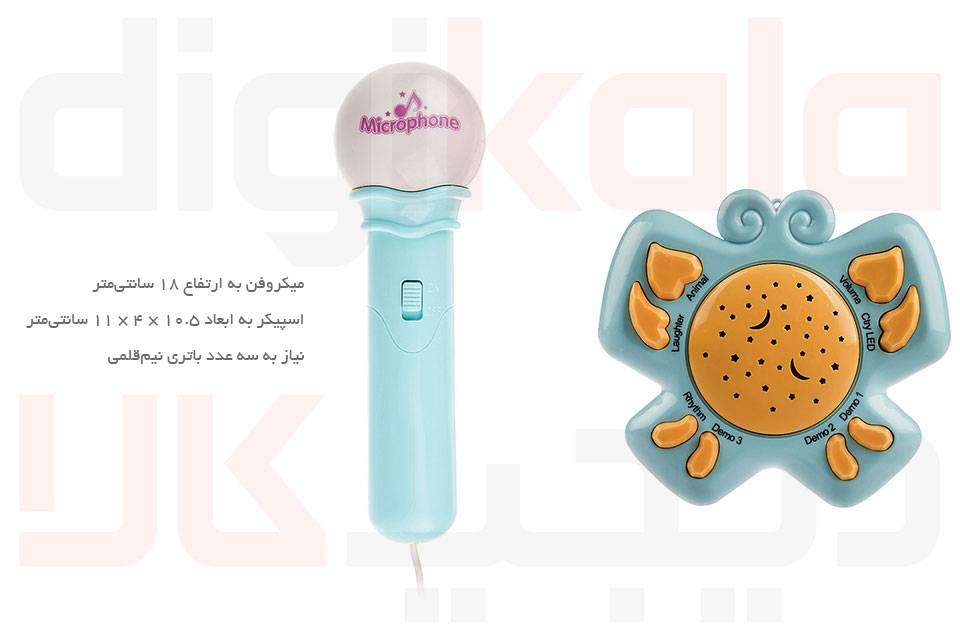 در این مجموعه‌ی دوعددی، یک اسپیکر به شکل پروانه به ابعاد 10.5 × 4 × 11 سانتی‌متر قرار گرفته است که قسمت میانی آن چراغ دارد. موسیقی به همراه نور همیشه کودکان را جذب خود خواهد کرد که مجموعه‌ی فوق هر دوی آن‌ها را دارد. همراه این اسپیکر پروانه‌ای‌شکل، یک میکروفون 18سانتی‌متری ارائه می‌شود که از آن می‌توان به‌عنوان پخش‌کننده‌ی صدا استفاده کرد. این میکروفون دکمه‌ی خاموش و روشن دارد و توسط کابل AUX به اسپیکر متصل می‌شود. اسپیکر و میکروفون در سه رنگ آبی روشن و زرد و صورتی در سایت موجود است که می‌توانید بنا به سلیقه‌ی خود و جنسیت فرزند دلبندتان، یکی از آن‌ها را انتخاب و خریداری کنید. می‌توانید توسط اسپیکر صدای شش حیوان مختلف را به فرزند دلبندتان آموزش دهید؛ علاوه‌براین سی ملودی مختلف به همراه سه صدای خنده و سه ریتم درام و سه دموی متنوع در آن وجود دارد که می‌توان از آن‌ها استفاده کرد. اسپیکر به سه باتری نیم‌قلمی نیاز دارد که در بسته موجود نیست.