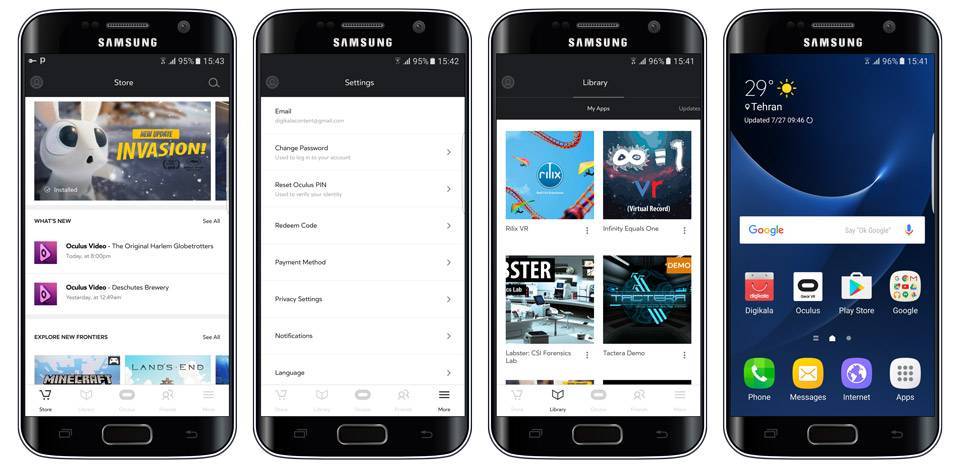 اگر از زحمت نصب برنامه و تغییر آی‌پی برای دانلود برنامه‌های تکمیلی بگذریم، توجه به این نکته ضروری به نظر می‌رسد که تنها می‌توانید در محیط برنامه‌ی مخصوصی به نام Oculus از این عینک استفاده کنید. با قراردادن گوشی داخل عینک، برنامه‌ی مخصوصش به‌صورت خودکار دانلود می‌شود؛ اما برای دانلود برنامه‌های تکمیلی که باعث کارایی صحیح Gear VR می‌شوند، حتما باید آی‌پی خود را تغییر دهید. بعد از دانلود و ورود به محیط برنامه، می‌توانید از برنامه‌ی Oculus، در گوشی و عینک استفاده کنید. محیط برنامه در گوشی سروسامان بهتری دارد و دسترسی به برنامه‌ها و دانلود آن‌ها هم ساده‌تر به نظر می‌رسد.