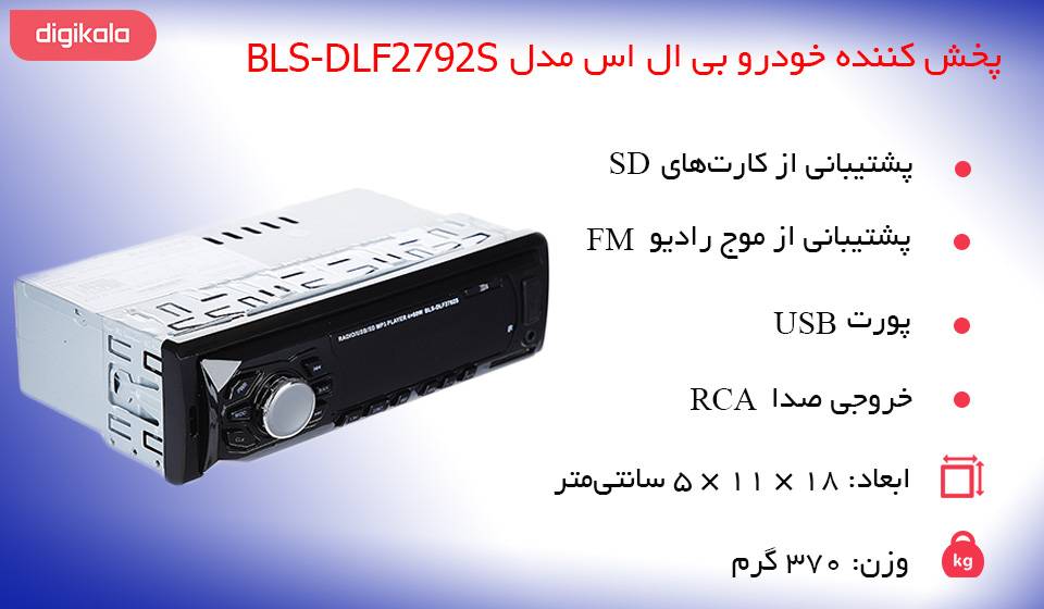 محصولی که مشاهده می‌کنید، پخش‌کننده‌ی خودروی «BLS» (بی ال اس) نام دارد که تحت عنوان «BLS-DLF2792S» به بازار عرضه شده است. این دستگاه به یک عدد پورت USB در قسمت جلویی مجهز است. با پیشرفت تکنولوژی به‌نوعی استفاده از CD منسوخ شده و افراد معمولا اطلاعات خود را روی حافظه‌های USB ذخیره می‌کنند. این امر در پخش‌کننده‌های خودرو هم کم‌کم شکل گرفته است و به جای استفاده از CD و DVD می‌توان با ذخیره‌ی موزیک‌های دلخواه روی حافظه‌های USB، در فضای داخلی خودرو به آن‌ها گوش کرد. علاوه‌براین، پخش‌کننده‌ی بی ال اس به درگاه کارت‌خوان SD نیز مجهز است و شما از این طریق هم می‌توانید به موزیک‌های موردعلاقه‌ی خود گوش دهید. وجود موج رادیویی FM از دیگر ویژگی‌های این دستگاه پخش‌کننده‌ی خودروست. محصول دارای نور پس‌زمینه‌ی قرمزرنگ است که باعث زیباشدن جلوه‌ی آن می‌شود. با انتخاب پخش‌کننده‌ی خودرو بی ال اس از گوش‌دادن به موزیک در فضای داخلی خودروی خود لذت ببرید.