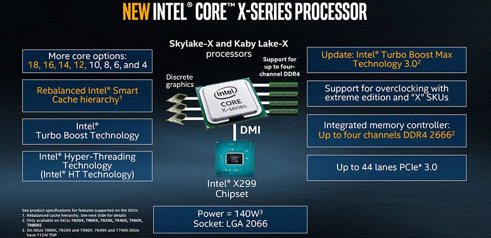همزمان با معرفی محصولات خانوادهی Skylake-X یک سوکت جدید از جانب اینتل معرفی شد. این سوکت با نام LGA2066 در اختیار سازندگان مادربرد قرار گرفت و چیپست جدید X299 هم برای همراهی با مقتضیات پردازندهی جدید معرفی شد. بر خلاف سیاست قبلی اینتل در نگه داشتن یک سوکت برای چند نسل، گویا این شرکت حالا تصمیم گرفته با معرفی هر نسل، یک سوکت و چیپست جدید هم معرفی کند تا حتی مشتری نسل قبلی هم متحمل هزینههای خرید مادربرد جدید شود. چیپست X299 از 128 گیگابایت حافظهی DDR4 پشتیبانی میکند و حداکثر فرکانس رم پشتیبانی شده در پردازندههای Core-X تا 2666 مگاهرتز میرسد و در برخی از مدلها، حداکثر فرکانس رم به 2400 مگاهرتز محدود شدهاست. اینتل در این چیپست، پشتیبانی از چینش 4 کاناله را فعال کرده و تقریبا در تمام مادربردهای مجهز به چیپست X299 میتوان اسلاتهای متعدد رم در طرفین سوکت پردازنده را دید. تعداد مسیرهای PCI Express در پردازندههای این خانواده متغیر است که از 16 مسیر شروع میشود و تا 44 مسیر ادامه پیدا میکند. در مدلهایی که با کد 76 و 77 شروع میشوند، 16 مسیر PCI Express داریم و در مدلهای 78 و 79 به ترتیب شاهد 28 و 44 مسیر هستیم. به عنوان مثال، مدل Core i9-7900X بهترین و کاملترین مدلی است که در حال حاضر میتوان از این خانواده تهیه کرد و با در اختیار داشتن 10 هسته و 44 مسیر ارتباطی، یک هیولای بالغ محسوب میشود.