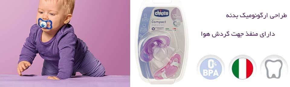 محصولی که می‌بینیم پستانک مدل (59379) از سری پستانک‌های فیزیو برند «چیکو» است. این مدل از پستانک برند «چیکو» با سایز سه، از 12 ماهگی به بعد نوزاد قابل استفاده است. بسته‌بندی این محصول دارای 2 عدد پستانک هم سایز، در دو رنگ‌بندی متفاوت است. هر دو این پستانک‌ها دارای سری از جنس سیلیکون و از نوع ارتودنسی هستند. طراحی ارتودنسی محصول باعث می‌شود پستانک در درازمدت فرم فک و لثه نوزاد را تغییر ندهد. همان‌طور که اشاره کردیم سری پستانک از جنس سیلیکون است. جنس سیلیکون نسبت به لاتکس از دوام و ماندگاری بالاتری برخوردار است. همچنین بدنه هر یک از این پستانک‌ها جنسی پلاستیکی داشته و روی آن‌ها منفذهایی در نظر گرفته شده که به عبور جریان هوا روی پوست نوزاد کمک می‌کند. این پستانک‌ها دارای حلقه بوده که برای آویزان کردن بند پستانک، می‌توانید از این حلقه‌ها استفاده کنید. در تولید این پستانک‌ها از متریال خوب و با کیفیتی استفاده شده و محصول فاقد ماده مضر و خطرناک BPA است.