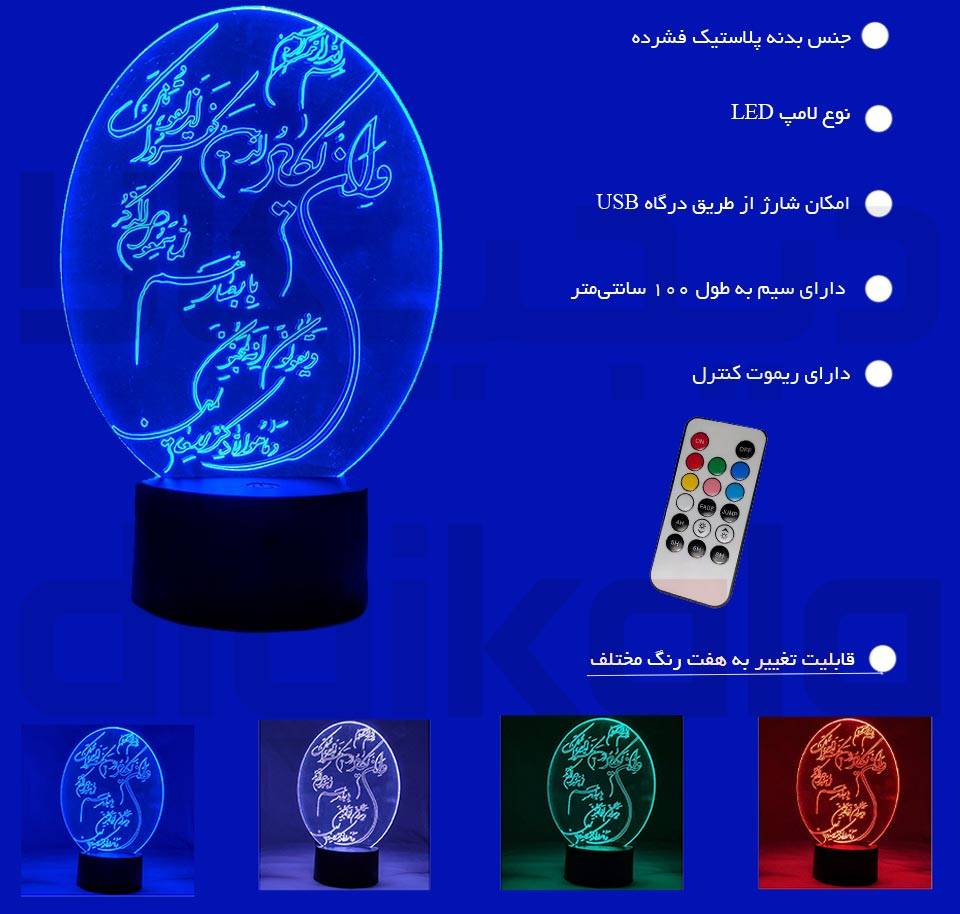 این چراغ خواب زیبا که مزین به آیه‌ی «و ان یکاد» است از امکانات زیادی بهره می‌برد. این مدل امکان تغییر به هفت رنگ مختلف را دارد و همچنین از قابلیت تنظیم شدت نور برخوردار است. این تغییرات به کمک یک ریموت کنترل که همراه محصول عرضه می‌شود انجام خواهد شد. همچنین نور این چراغ خواب از طریق لامپ LED تامین می‌شود که مثل همه‌ی لامپ‌های LED از مزایای زیادی مثل طول عمر بالا و مصرف کم برخوردار است.
