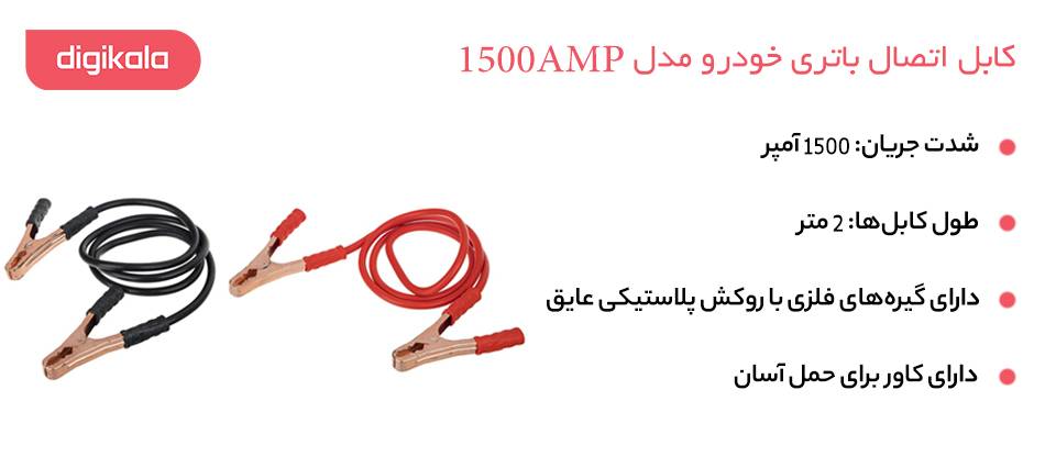 محصولی که در تصویر مشاهده می‌کنید، کابل اتصال باتری خودرو مدل «1500AMP» است که درون یک کاور پلاستیکی شفاف عرضه می‌شود. این محصول دارای 2 کابل 2 متری بوده و مغزی مسی آن می‌تواند شدت‌جریانی تا 1500 آمپر را از خود عبور دهد. گیره‌های این کابل با روکشی لاستیکی و عایق پوشیده شده‌اند. این محصول برای تمام خودروهای سبک مناسب و قابل‌استفاده است.