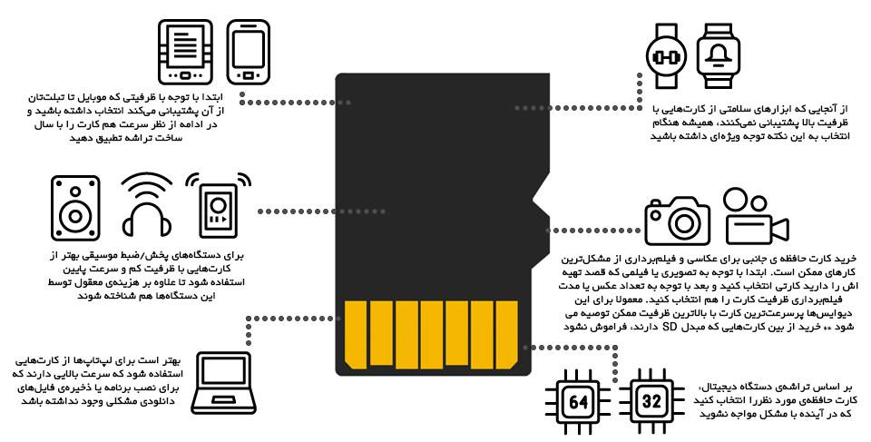 این روز‌ها هر ظرفیتی از micro SD که مدنظرتان باشد، پیدا می‌کنید. مهم است چه مقدار از ظرفیت کارتی را که انتخاب کرده‌اید پر می‌کنید و مهم‌تر اینکه قصد دارید آن را برای چه دستگاهی استفاده کنید. مهم‌ترین نکته‌ای که باید هنگام خرید به آن دقت کنید، ظرفیتی است که دستگاه شما پشتیبانی می‌کند. اگر برای گوشی یا تبلت قصد خرید دارید، تراشه‌ی استفاده‌شده در این دستگاه‌ها مشخص‌کننده‌ی ظرفیتی است که دستگاه‌تان بدون مشکل از آن پشتیبانی می‌کند. برای دوربین‌ها موضوع کمی فرق دارد و بسیاری از دوربین‌ها، هر ظرفیتی از micro SD را پشتیبانی می‌کنند، این نکته را هم در نظر داشته باشید که برای استفاده از micro SD در دوربین‌های حرفه‌ای حتما باید از تبدیل استفاده کنید، این نکته را هنگام خرید رعایت کنید تا بتوانید از کارت خود در هر دوربینی استفاده کنید. در حال حاضر، دستگاه‌های دیجیتال می‌توانند ظرفیت‌هایی بین 2گیگابایتی تا 2ترابایتی micro SD کارت‌ها را پشتیبانی کنند؛ البته که در حال حاضر نهایت ظرفیت این کارت‌ها 512 گیگابایت است که قیمت فوق‌العاده زیادی دارند.