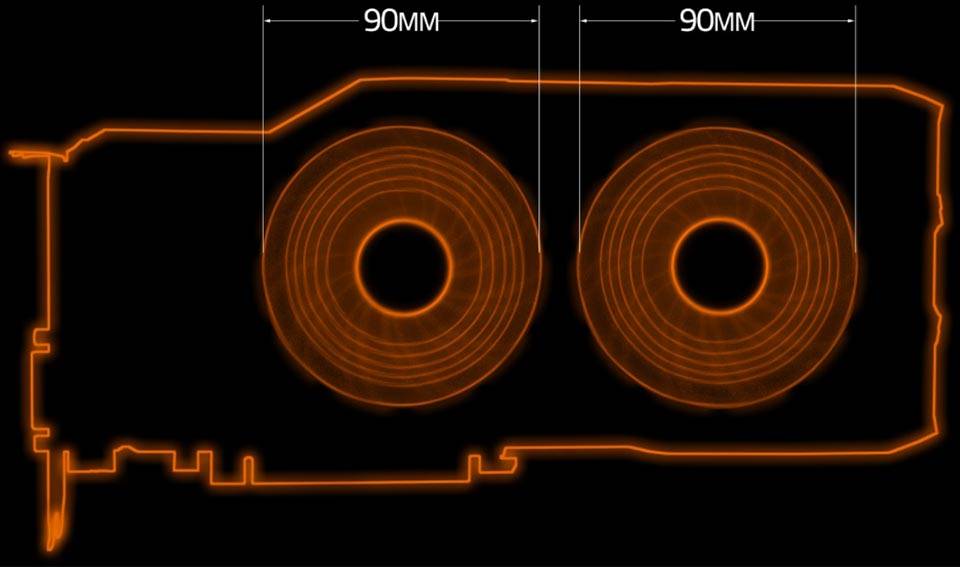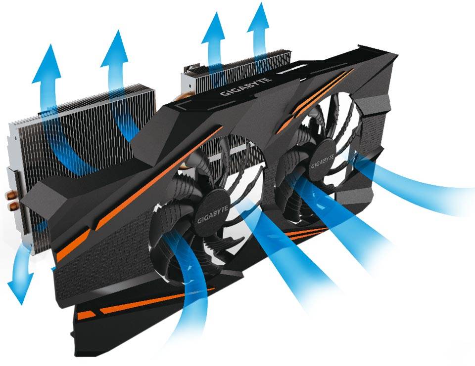 این فن‌ها طراحی خاصی دارند و نسبت به فن‌های ساده می‌توانند 23 درصد گردش هوای بیشتری را ایجاد کنند. همچنین زمانی که دمای GPU پایین باشد این فن‌ها به صورت خودکار خاموش می‌شوند تا هیچ صدایی توسط کارت گرافیک تولید نشود و با بالا رفتن دما فن‌ها شروع به کار می‌کنند. این هوا به لایه‌ی زیرین منتقل می‌شود که از پره‌های آلومینیومی و 2 لوله کامپوزیت مس تشکیل شده است. طراحی لوله‌ها به ترتیبی است که داخل آن یک لوله کامپوزیتی تو خالی وجود دارد و لایه بیرونی آن هم از مس شیاردار ساخته شده و بین این دو لایه هم مایع خنک کننده قرار گرفته است. طبق گفته گیگابایت این لوله‌ها 29 درصد کارایی بهتری نسبت به لوله‌های ساده مسی دارند. تمامی این لوله‌ها و پره‌ها هم با یک صفحه فلزی بزرگ به کارت گرافیک متصل شده‌اند تا بیشترین سطح تماس را با آن داشته باشند.