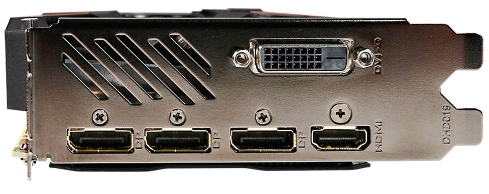 این کارت گرافیک رده بالا دارای پنج پورت خروجی است که پورتهای نسل جدید سهم بیشتری از این تعداد را دارند. به ترتیبی که در این محصول شاهد سه پورت DisplayPort 1.4، یک HDMI 2.0b و یک Dual-Link DVI-D هستیم. میتوان همزمان تا 4 مانیتور را به این کارت گرافیک متصل کرد و در نهایت به وضوح تصویر 7680x4320 پیکسل رسید. از آنجایی که پورت HDMI از نوع HDMI 2.0 است قابلیت ارائه تصویر تا رزولوشن 4096x2160 را دارد و از محتوای 4K در حالت 60 Hz پشتیبانی میکند. این کارت گرافیک از قابلیت SLI هم پشتیبانی میکند و روی آن دو رابط SLI وجود دارد. برای برقرسانی هم یک کانکتور 8 پین در این محصول تعبیه شده است. حداقل پاور مورد نیاز برای عملکرد مناسب آن هم 500 وات است.