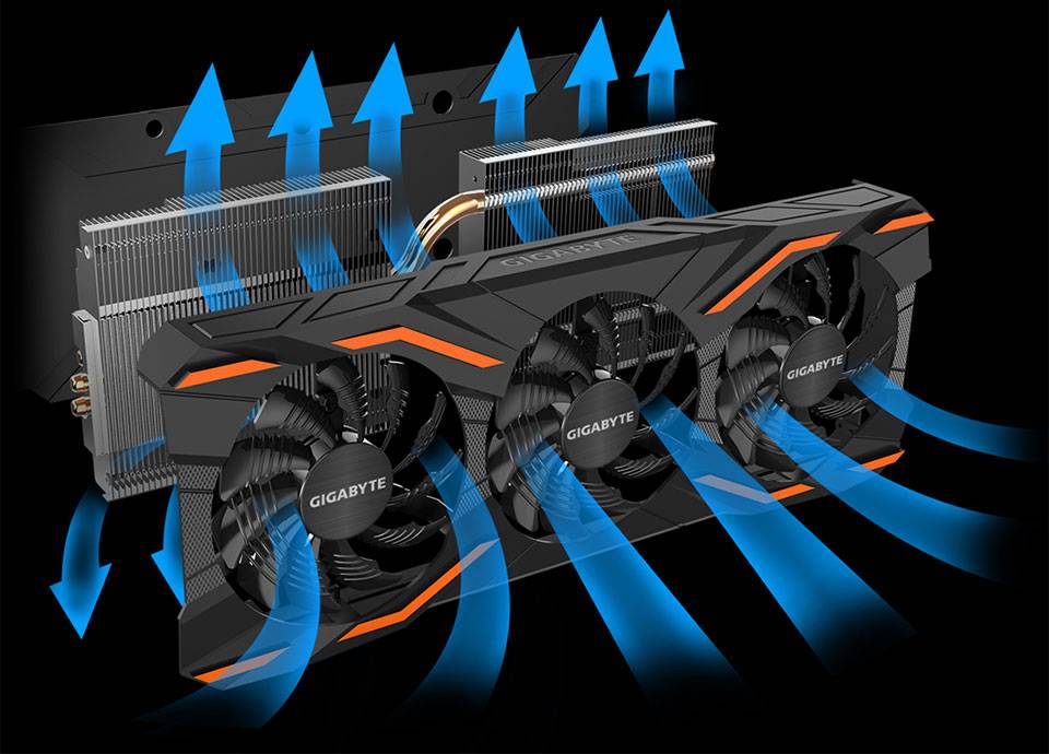 این فنها طراحی خاصی دارند و نسبت به فنهای ساده میتوانند 23 درصد گردش هوای بیشتری را ایجاد کنند. همچنین زمانی که دمای GPU پایین باشد این فنها به صورت خودکار خاموش میشوند تا هیچ صدایی توسط کارت گرافیک تولید نشود و با بالا رفتن دما فنها شروع به کار میکنند. این هوا به لایهی زیرین منتقل میشود که از پرههای آلومینیومی و 3 لوله کامپوزیت مس تشکیل شده است. طراحی لولهها به ترتیبی است که داخل آن یک لوله کامپوزیتی تو خالی وجود دارد و لایه بیرونی آن هم از مس شیاردار ساخته شده و بین این دو لایه هم مایع خنک کننده قرار گرفته است. طبق گفته گیگابایت این لولهها 29 درصد کارایی بهتری نسبت به لولههای ساده مسی دارند. تمامی این لولهها و پرهها هم با یک صفحه فلزی بزرگ به کارت گرافیک متصل شدهاند تا بیشترین سطح تماس را با آن داشته باشند.