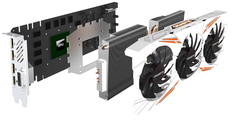 این فنها طراحی خاصی دارند و نسبت به فنهای ساده میتوانند 23 درصد گردش هوای بیشتری را ایجاد کنند. همچنین زمانی که دمای GPU پایین باشد این فنها به صورت خودکار خاموش میشوند تا هیچ صدایی توسط کارت گرافیک تولید نشود و با بالا رفتن دما فنها شروع به کار میکنند. این هوا به لایهی زیرین منتقل میشود که از پرههای آلومینیومی و 5 لوله کامپوزیت مس تشکیل شده است. طراحی لولهها به ترتیبی است که داخل آن یک لوله کامپوزیتی تو خالی وجود دارد و لایه بیرونی آن هم از مس شیاردار ساخته شده و بین این دو لایه هم مایع خنک کننده قرار گرفته است. طبق گفته گیگابایت این لولهها 29 درصد کارایی بهتری نسبت به لولههای ساده مسی دارند. تمامی این لولهها و پرهها هم با یک صفحه فلزی بزرگ به کارت گرافیک متصل شدهاند تا بیشترین سطح تماس را با آن داشته باشند.