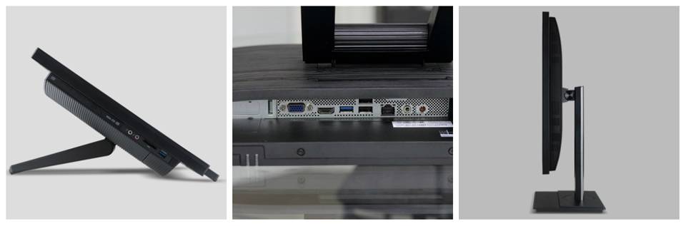 اکثر پورت‌ها و درگاه‌ها در زیر صفحه‌نمایش قرار دارد که هم خوب است هم بد. خوب از این نظر که لبه‌های کناری شلوغ نمی‌شوند و بد از این نظر که دیدن آن‌ها و توانایی اتصال گجت‌های مختلف سخت خواهد بود. در این قسمت به ترتیب پورت شبکه LAN، دو پورت USB 2.0، یک پورت USB 3.0،‌ پورت HDMI و پورت VGA قرار دارد. همان‌طورکه می‌بینید کمبودی در این دستگاه از نظر درگاه‌های ارتباطی وجود ندارد و فقط نبود پورت‌های نسل جدید مثل  USB Type-C احساس می‌شود که البته با توجه به رده‌ی کاربری و قیمت محصول این مسئله اصلا به چشم نمی‌آید.
