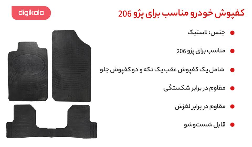 محصولی که در تصویر مشاهده میکنید کفپوش خودرو مناسب برای خودرو 206 است. این کفپوش به صورت سه تکه طراحی و تولید میشود که دو تکه آن در قسمت جلو و یک تکه آن در قسمت عقب خودرو قرار میگیرد. این کفپوش تنها برای خودوری پژو 206 قابل استفاده است و بر روی آن نام 206 حک شده است. جنس به کار رفته در کفپوش فوق، ساختاری پلاستیکی دارد و در کنار برخورداری از انعطاف بسیار بالا، مقاومت بسیار زیادی در برابر ساییدگی، شکستگی و خوردگی دارد. طرحهای روی کفپوش به همراه جنس به کار رفته در ساخت آن، مانع از سر خوردن پای سرنشینان میشود. اگرچه کفپوشهای خودرو در پایینترین قسمت داخل کابین خودرو قرار میگیرند، اما نقش موثری در زیبایی هرچه بیشتر درون اتاق خودرو ایفا میکنند. در انتخاب کفپوشها پارامترهایی مانند جنس و نوع طراحی اهمیت زیادی دارد، چرا که دایما در تماس با پای سرنشینان خودرو در تماسند و ممکن است دچار فرسایش زودهنگام شوند.
