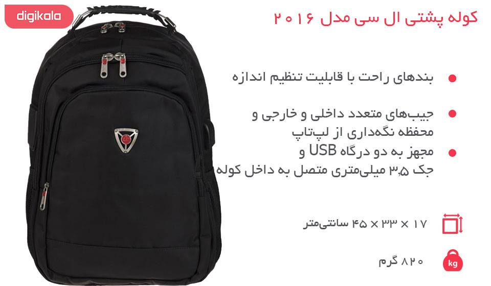 کولهپشتی «ال سی» مدل «2016» محصولی مناسب برای افرادی است که به دنبال کولهای راحت برای استفادهی روزمرهی خود میگردند. این محصول دو پورت USB و جک 3.5میلیمتری دارد که باعث میشود با گزینهای مناسب برای عصر مدرن مواجه شویم. این پورتها از داخل به سیمهایی متصل هستند تا بتوان بهسادگی در زمان حمل کوله، تلفن همراه خود را شارژ کرد یا به شکلی مناسب به موسیقی موردعلاقه گوش سپرد. این کیف را به شکلی تولید کردهاند که در زمان حمل آن بتوان راحتی را تجربه کرد. پدهای فومی استفادهشده در بندها و همچنین قسمت پشتی موجب میشوند فشار کمتری به شانهها و پشت وارد شود و بتوان در زمان حمل کوله، احساس راحتی داشت. پارچهی استفادهشده نیز از مقاومت خوبی دربرابر پارگی و پوسیدگی برخوردار است و باعث میشود این محصول دوام و عمر خوبی داشته باشد و بتواند بهخوبی از وسایل داخل خود محافظت کند. وجود جیبهای داخلی و بیرونی برای این کولهپشتی نیز موجب میشوند تا بتوان تا حدی وسایل همراه خود را تفکیک کرده و بهتر در دسترس قرار داد. داشتن محفظهی مخصوص لپتاپ هم استفاده از این کوله را برای افراد درگیر با تکنولوژی مناسبتر میسازد.