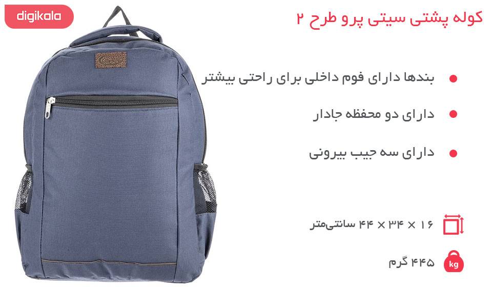 «کولهپشتی سیتی پرو طرح 2» به شکلی طراحی شده است که برای حمل وسایل روزمره گزینهی مناسبی باشد. پارچهی استفادهشده برای تولید این کولهپشتی مقاومت خوبی دربرابر پارگی و پوسیدگی دارد. همچنین این پارچه وزن مناسبی را برای کوله فراهم آورده است که حمل راحتتر آن را در پی دارد. ابعاد و اندازهی درنظرگرفتهشده برای این محصول نیز به حدی است که آن را برای حمل وسایل روزمره یا ورزشی مناسب میسازد. این کوله دارای دو محفظهی اصلی و جیبهای داخلی و خارجی است که تفکیککردن وسایل همراه را آسانتر میسازد. چهار دسته برای حمل این کوله وجود دارد که دو عدد در بالا برای حمل دستی و دو بند دیگر در پشت برای حمل به صورت کولهپشتی قرار دارند. بندهای دوشی از فوم داخلی هم بهره میبرند که موجب راحتی بیشتر در زمان حمل خواهند شد. کولهپشتی سیتی پرو طرح 2 با طراحی و ساختار خوبی که دارد، گزینهای مناسب برای خرید کولهپشتی شهری خواهد بود.