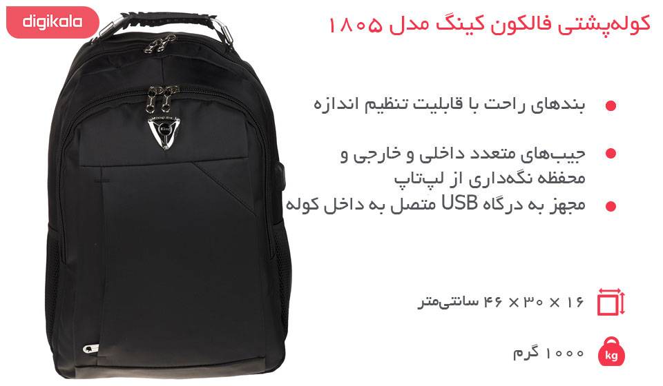 کوله‌پشتی فالکون کینگ مدل 1805 در حدود 19 لیتر ظرفیت دارد و به همین دلیل می‌تواند برای استفاده‌ی شهری مناسب باشد. استفاده از پارچه‌ای محکم و مقاوم، ساختار راحت در قسمت بندها و پشت کوله، جیب‌های متعدد داخلی و خارجی، محفظه‌ی مخصوص لپ‌تاپ و وجود درگاه‌ USB نیز باعث می‌شوند تا با محصولی خوب و راحت برای حمل وسایل روزمره روبه‌رو شویم.