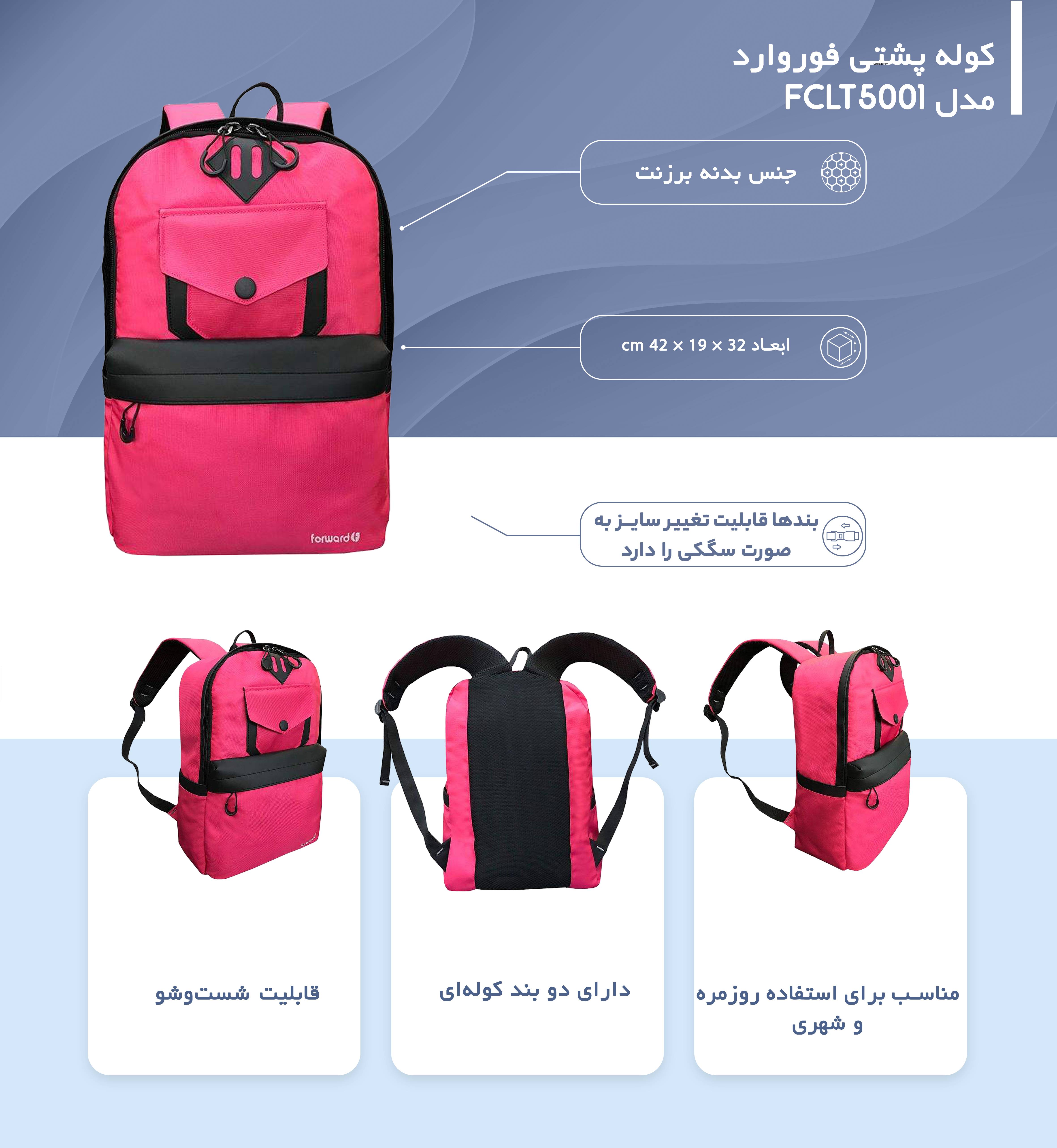 این محصول زیبا از جنس پلیاستر تهیه شده و همین متریال باعث شده تا ضد آب باشد و از مقاومت خوبی نسبت به سایر متریالها برخورد شود. ابعاد متوسط این کالا باعث شده تا حمل آن برای سنین مختلف آسانتر باشد و ابعاد این کالا به ترتیب 42، 19 در 32 سانتیمتر است که با توجه به این ابعاد حجم داخلی آن 24 لیتر میرسد. وزن کوله 650 گرم است در صورتی که وسایل خود را درون آن قرار دهید بیش از اندازه سنگین نمیشود تا در زمان راه رفتن جلوی حرکت ما را بگیرد. وجود 2 دسته یکی از در قسمت بالا و یکی در قسمت پشت کیف باعث شده تا به صورت دستی و کوله پشتی بتوانیم آن را حمل کنیم. بندهای پشتی این کیف به وسله سگک قابل تنظیم هستند. استفاده از پارچه با منافذ باز در قسمت پشت و بندهای این کوله به ما کمک می کند تا در زمان حمل آن کمتر تعریق کنیم. در قسمت جلوی کوله پشتی فوروارد مدل FCLT5001 دو جیب وجود دارد که یکی به صورت دکمه دارد و دیگری به صورت زیپی بسته میشود و در صورتی که وسایل مختلفی داشته باشیم میتوانیم به کمک این جیبها، برای آنها فضایی در نظر بگیریم. علاوه بر این دو جیب در قسمت طرفین هم جیبهای دیگری برای قرار دادن بطری آن تعبیه شده است. داشتن رنگبندی متنوع و زیاد این محصول دست ما را در انتخاب باز گذاشته است و از دیگر مزیتهای این کالا این است که به راحتی میتوان از آن فارغ از هر جنسیت و سنی استفاده برای کاربردهای گوناگون مثل کوله پشتی روزمره استفاده کرد.